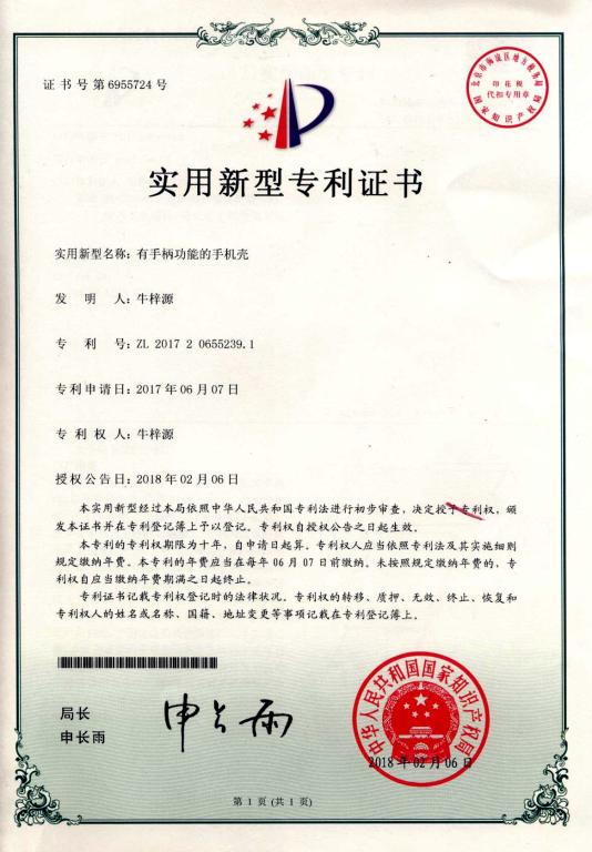 近日,从国家知识产权局获悉,yl6776永利集团2014级机械设计制造及其自动化专业牛梓源同学设计发明的《有手柄功能的手机壳》获批国家实用新型专利证书(专利号:ZL201720655239.1)。