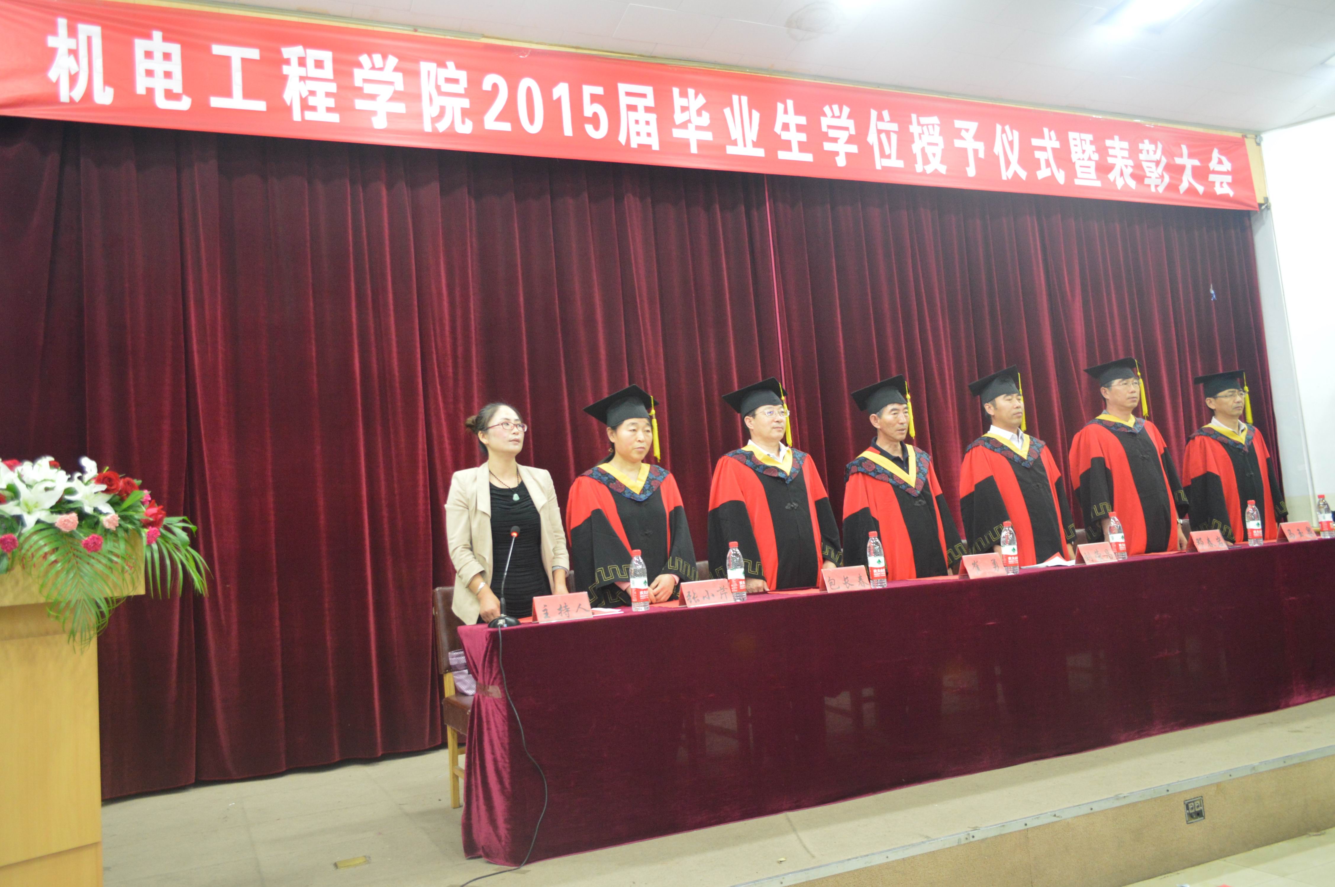 2015年6月14日下午2点30分,yl6776永利集团于学术报告厅举行了2015毕业生学位授予仪式暨表彰大会。出席大会的嘉宾有:yl6776永利集团党委书记崔勇、yl6776永利集团院院长刘荣昌、yl6776永利集团副院长包长春、yl6776永利集团党委副书记副院长邓春岩、电气工程教学部主任马玉泉、机械制造教学部主任张小芹,以及毕业班主任和学工办的老师们。