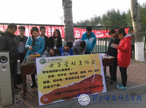 2014年11月8日上午,yl6776永利集团举办“爱心维修•情系你我他”公益维修活动。面对损坏的电子物品,电子爱好者协会会员们耐心的进行维修,并向现场同学们进行讲解。当天,电子爱好者协会还在昌黎校区招聘会现场举办了作品展示活动,并与招聘单位,学校领导、老师进行现场交流。