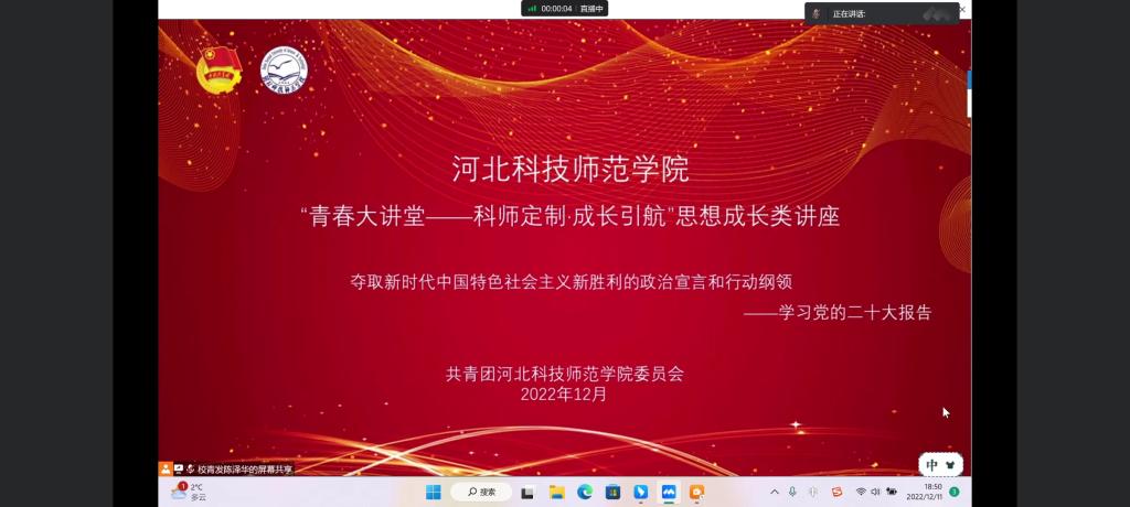 2022年12月11日晚,yl6776永利集团开展青春大讲堂思想引领类讲座。本次讲座学习了党的二十大报告,讲解了关于夺取新时代中国特色社会主义新胜利的政治宣言和行动纲领。